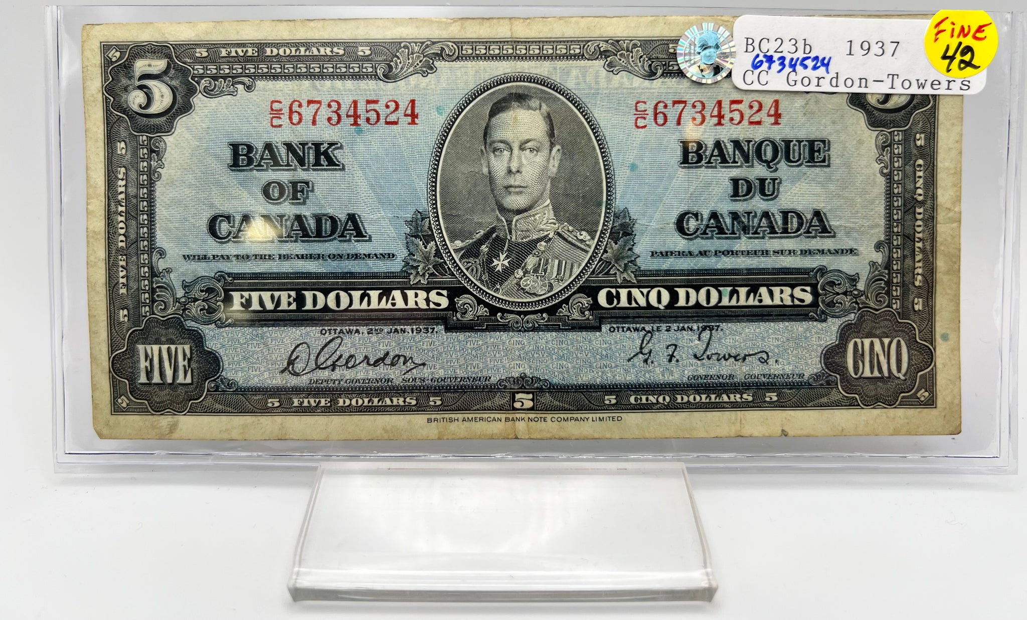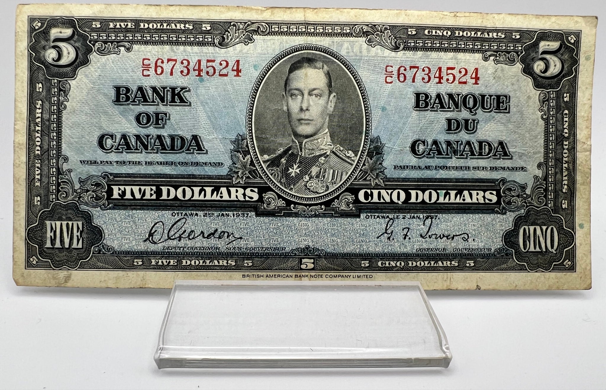 1937 Bank of canada BC-23b Five Dollars F-12 Gordon Towers, Serial-CC 6734524