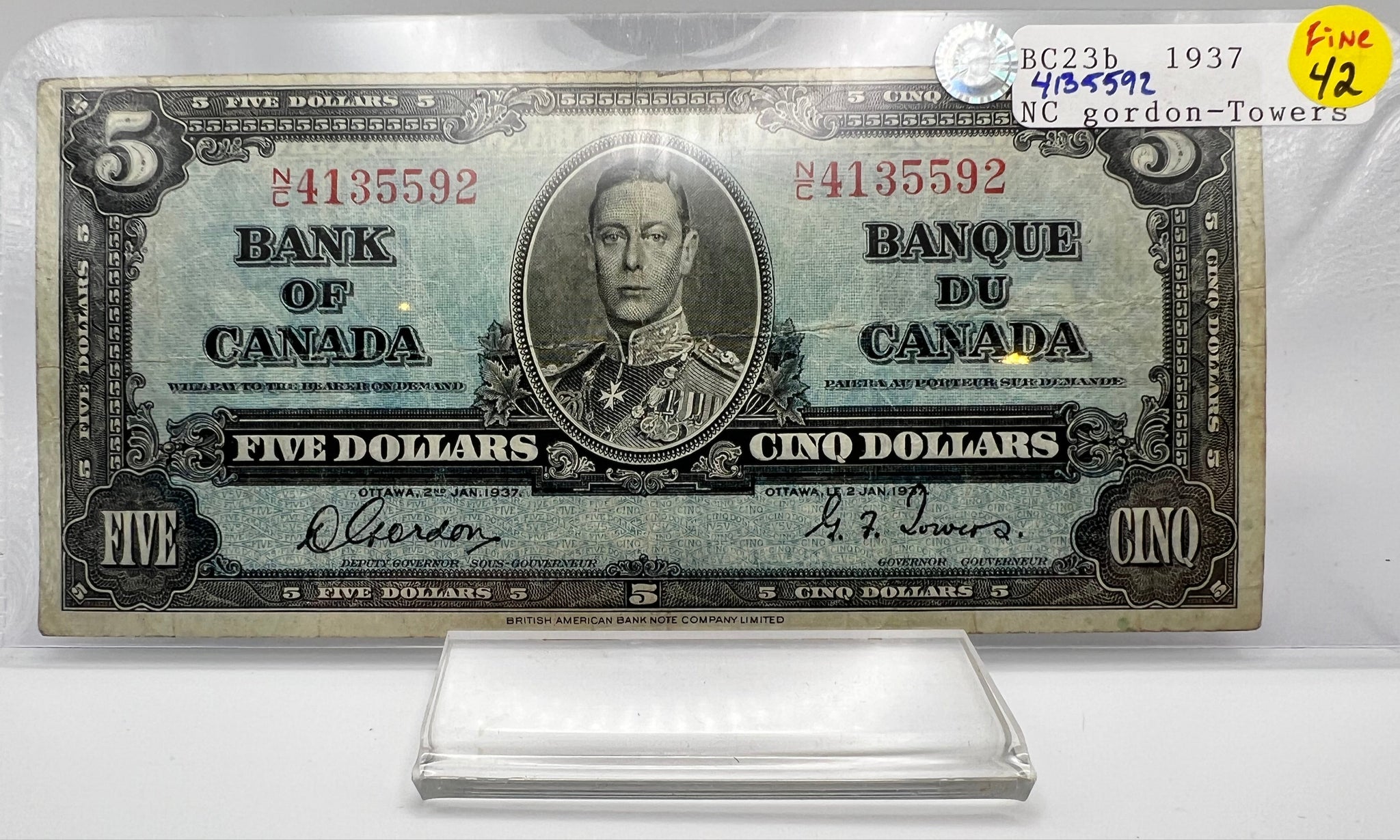 1937 Bank of canada BC-23b Five Dollars F-12 Gordon Towers, Serial-NC 4135592