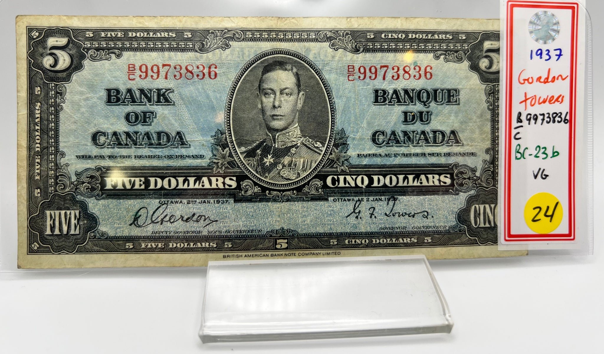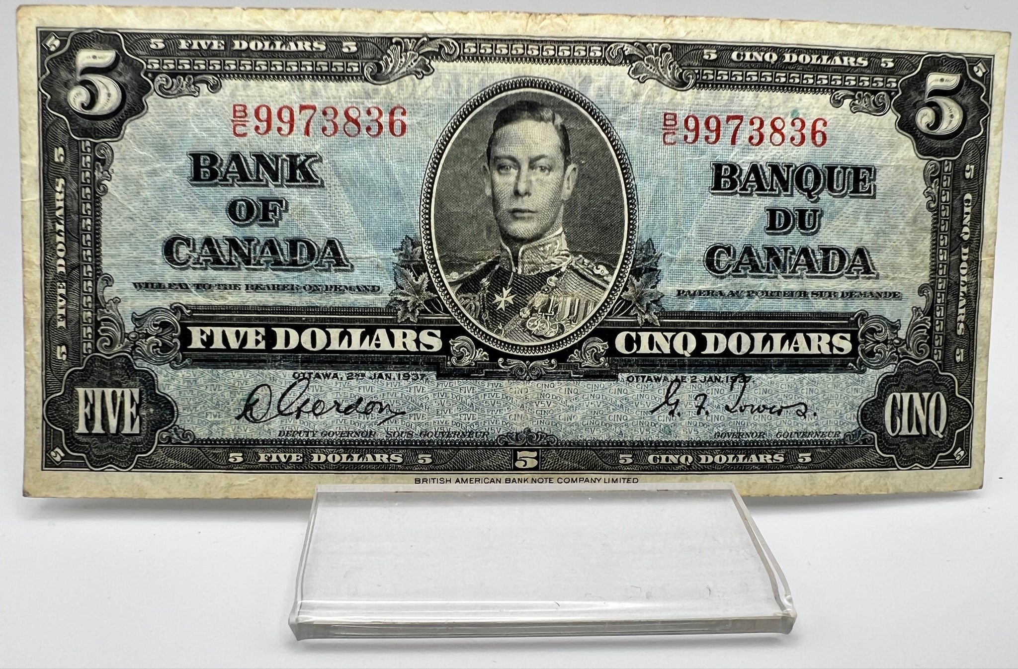 1937 Bank of canada BC-23b Five Dollars VG-8 Gordon Towers, Serial-BC 9973836