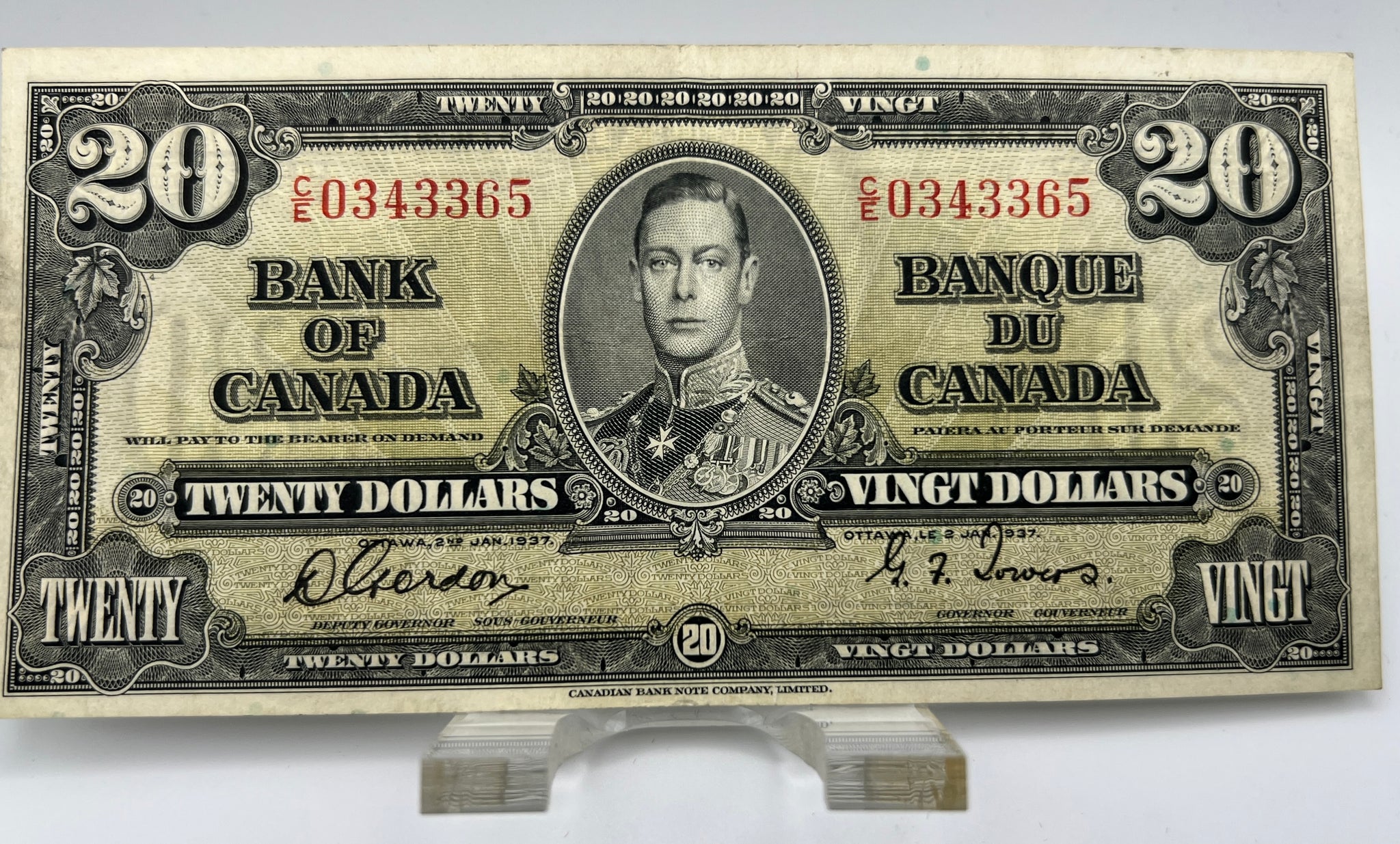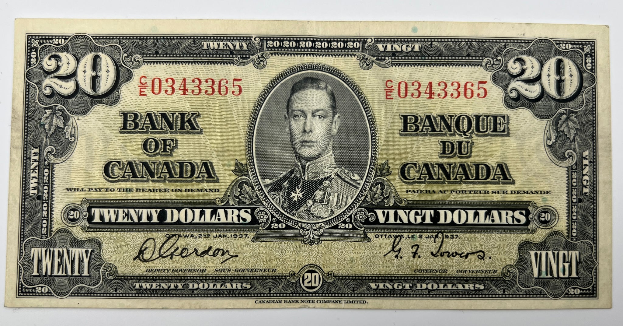 1937 Bank of canada BC-25b Twenty Dollars VF-20 Gordon Towers, Serial-CE 0343365
