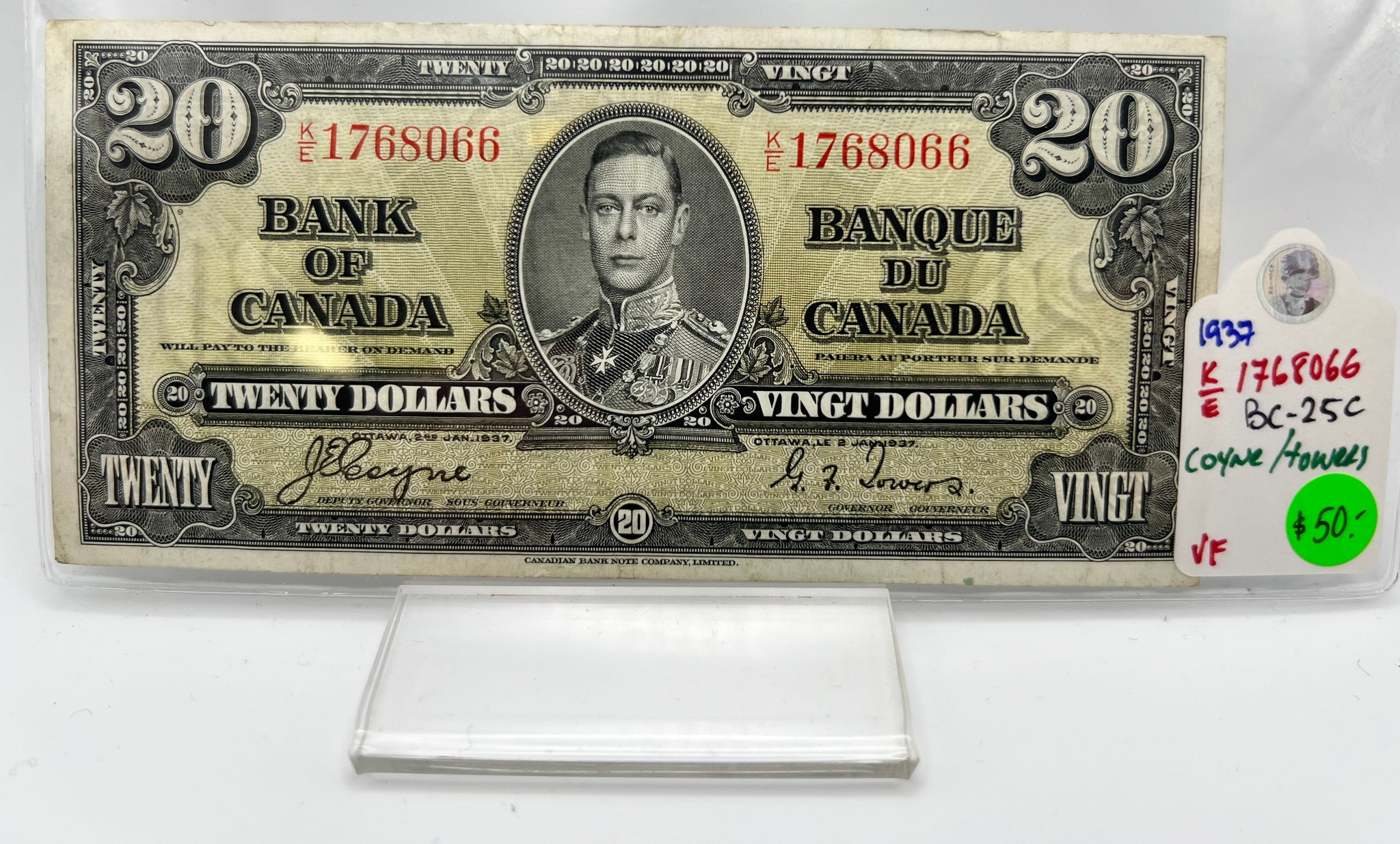 1937 Bank of canada BC-25c Twenty Dollars VF-20 Coyne Towers, Serial-KE 1768066