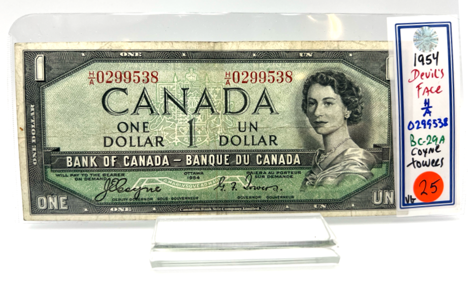 1954 Bank of Canada One Dollars VG Devil's Face Serial-HA 0299538