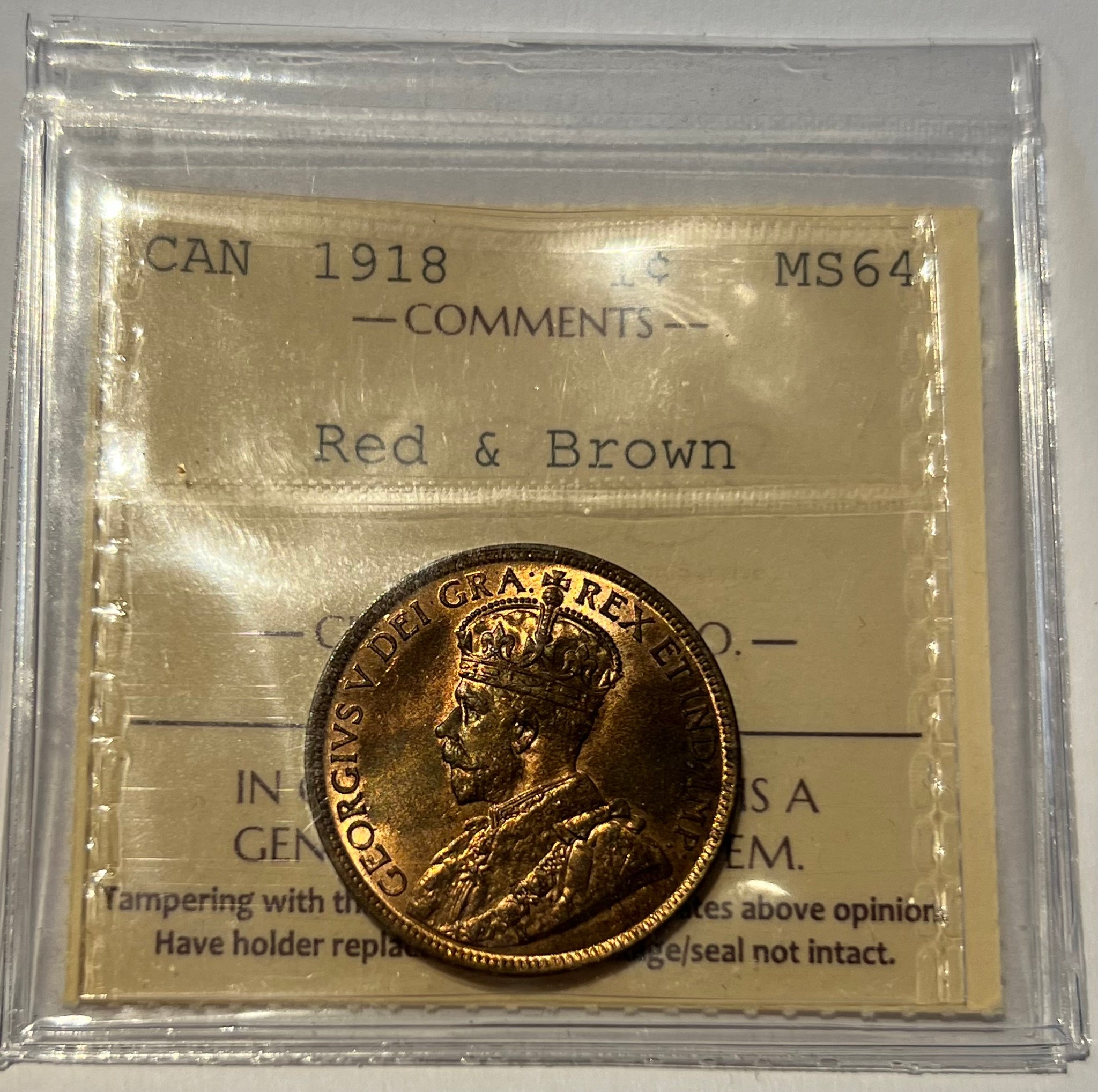 CANADA ONE CENT 1918 ICCS MS-64 RED & BROWN