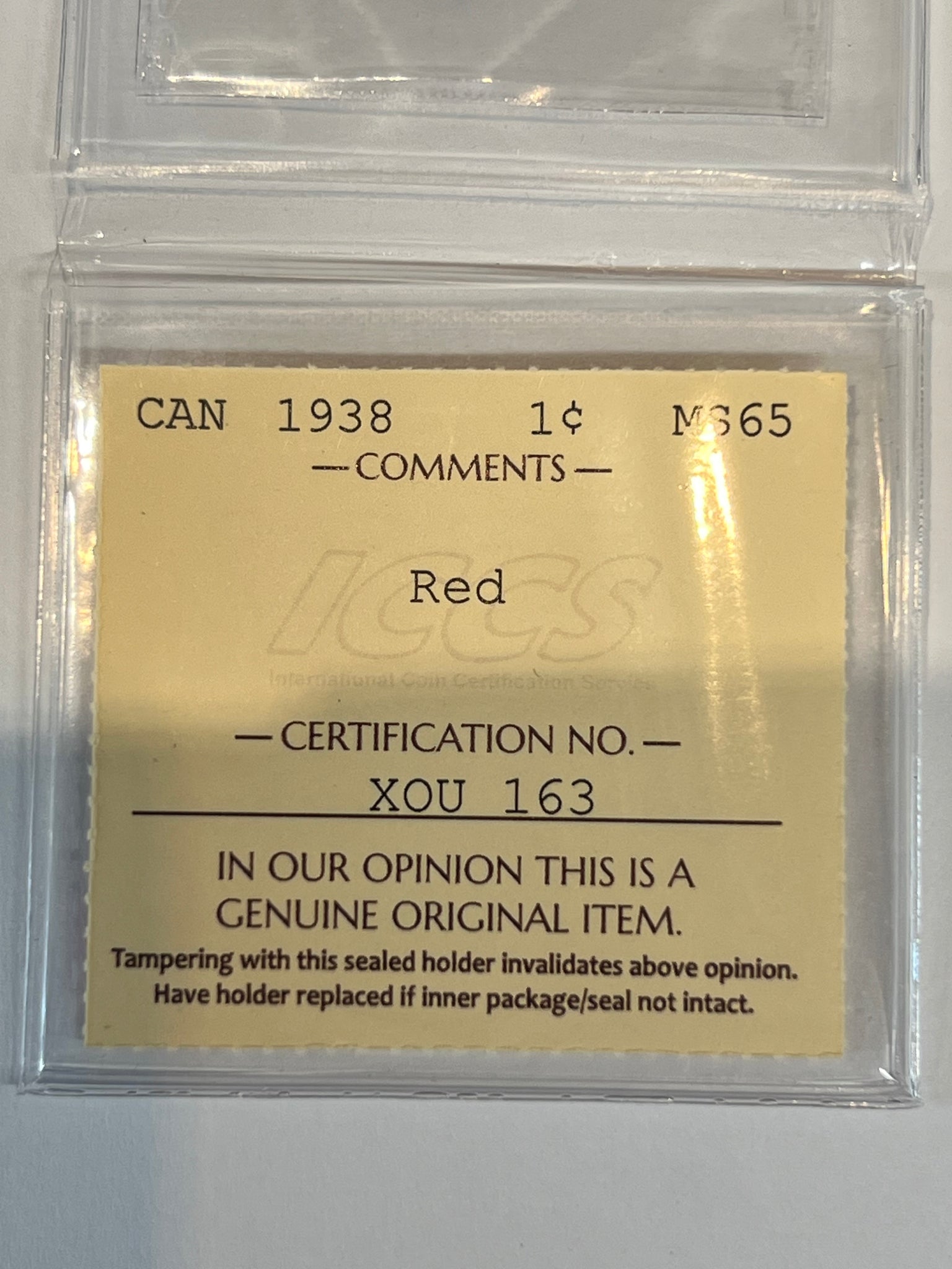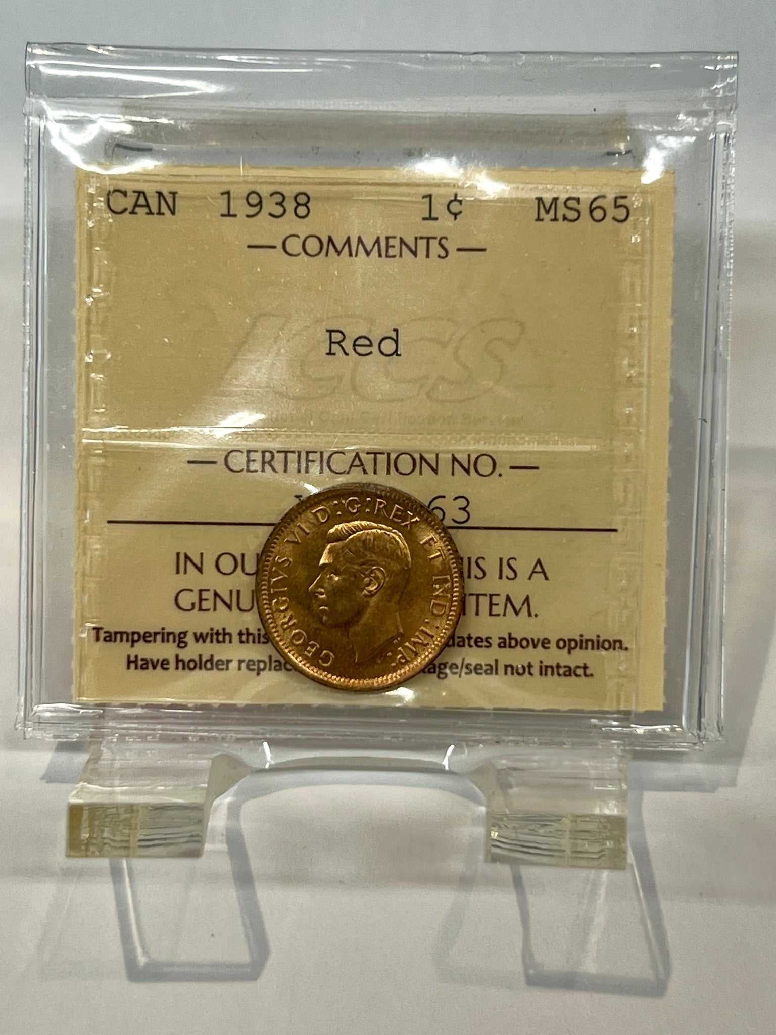 Canada One Cent 1938 MS-65 ICCS