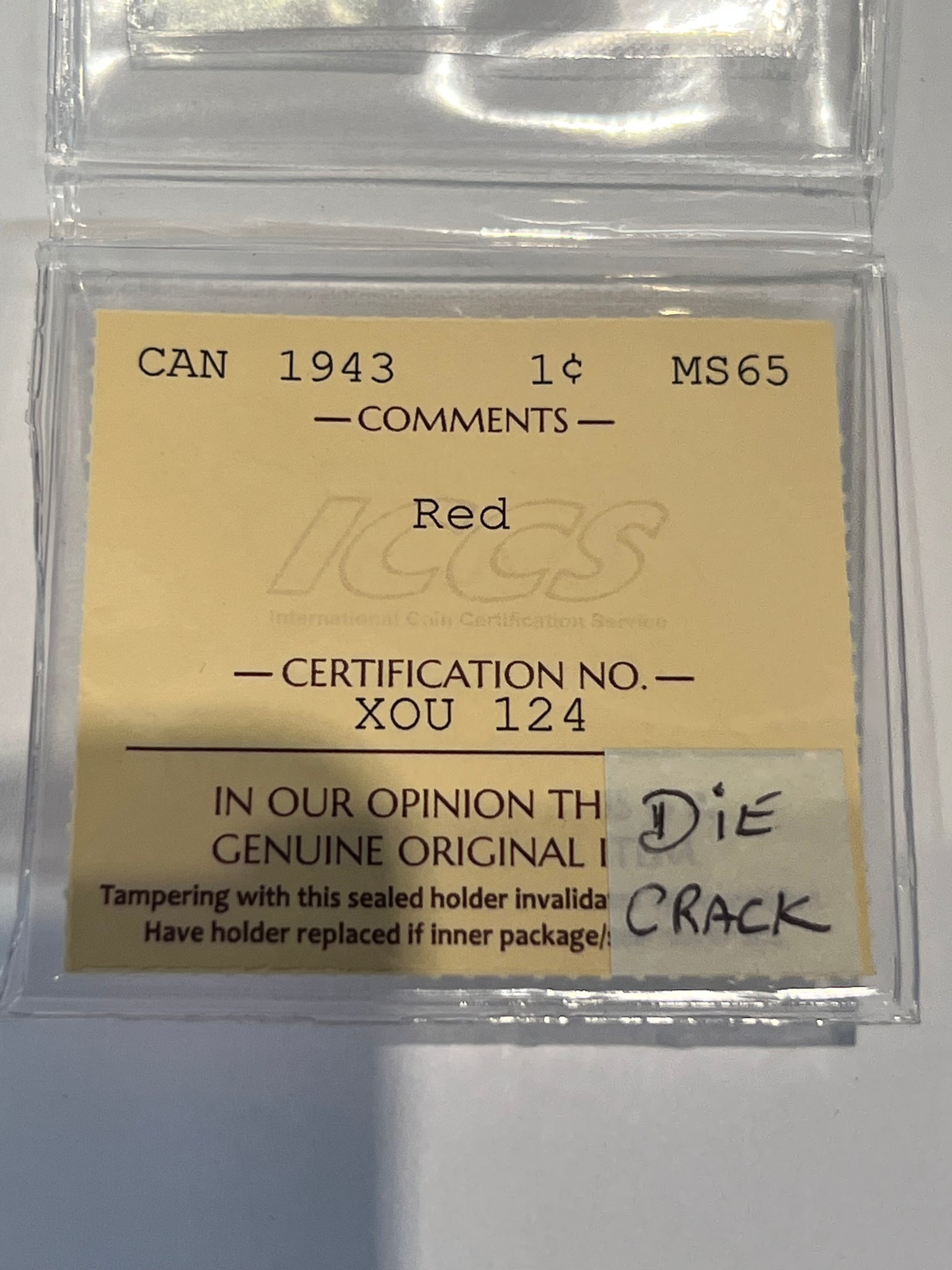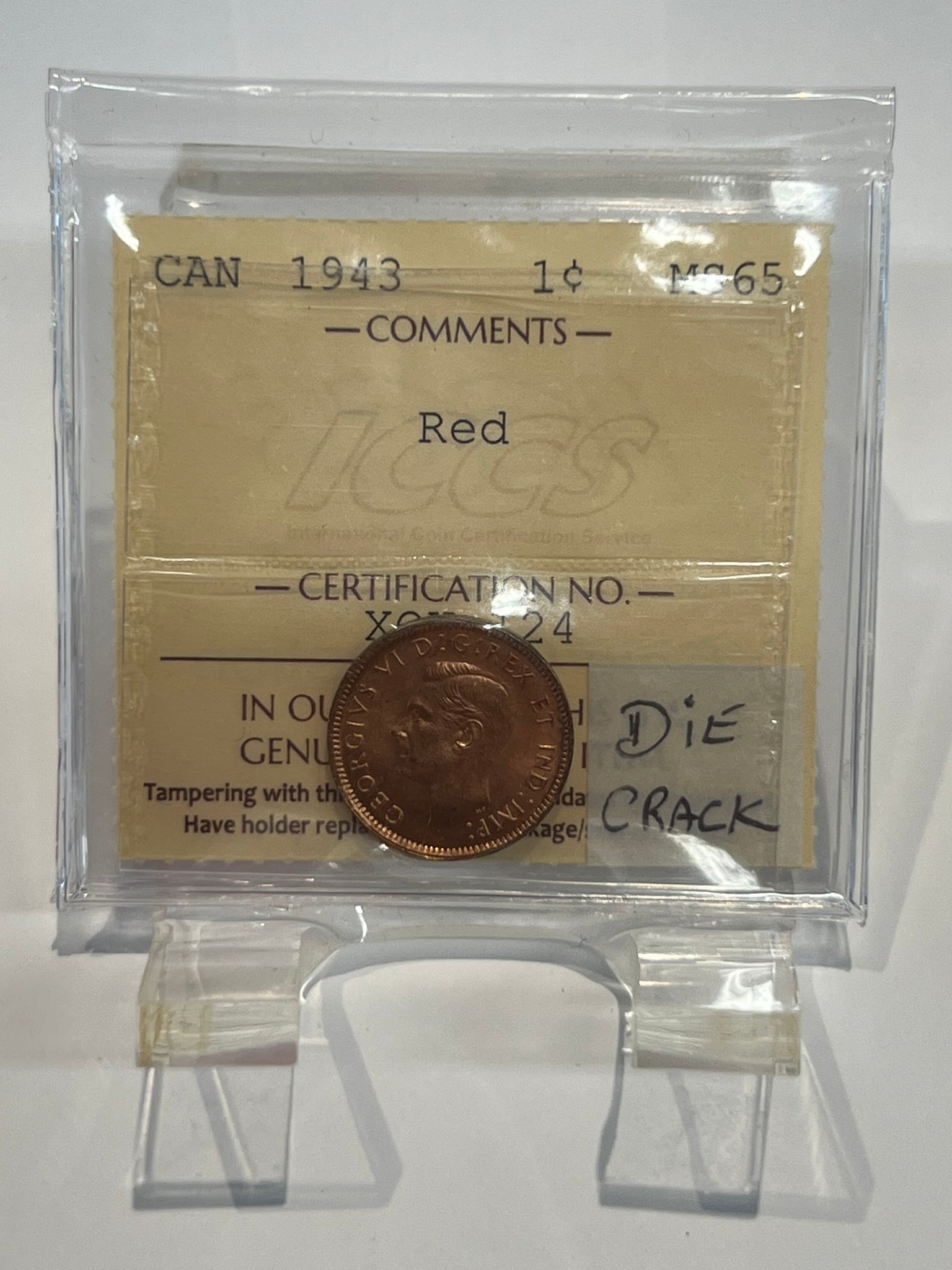 Canada One Cent 1943 MS-65 ICCS Die Crack