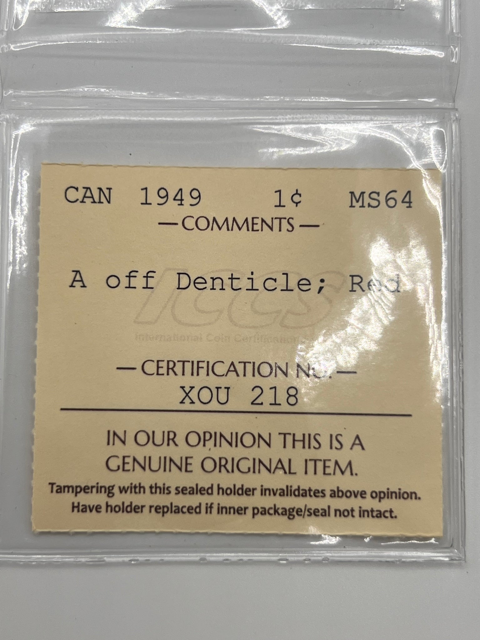 Canada One Cent 1949 A off Denticle MS-64 ICCS
