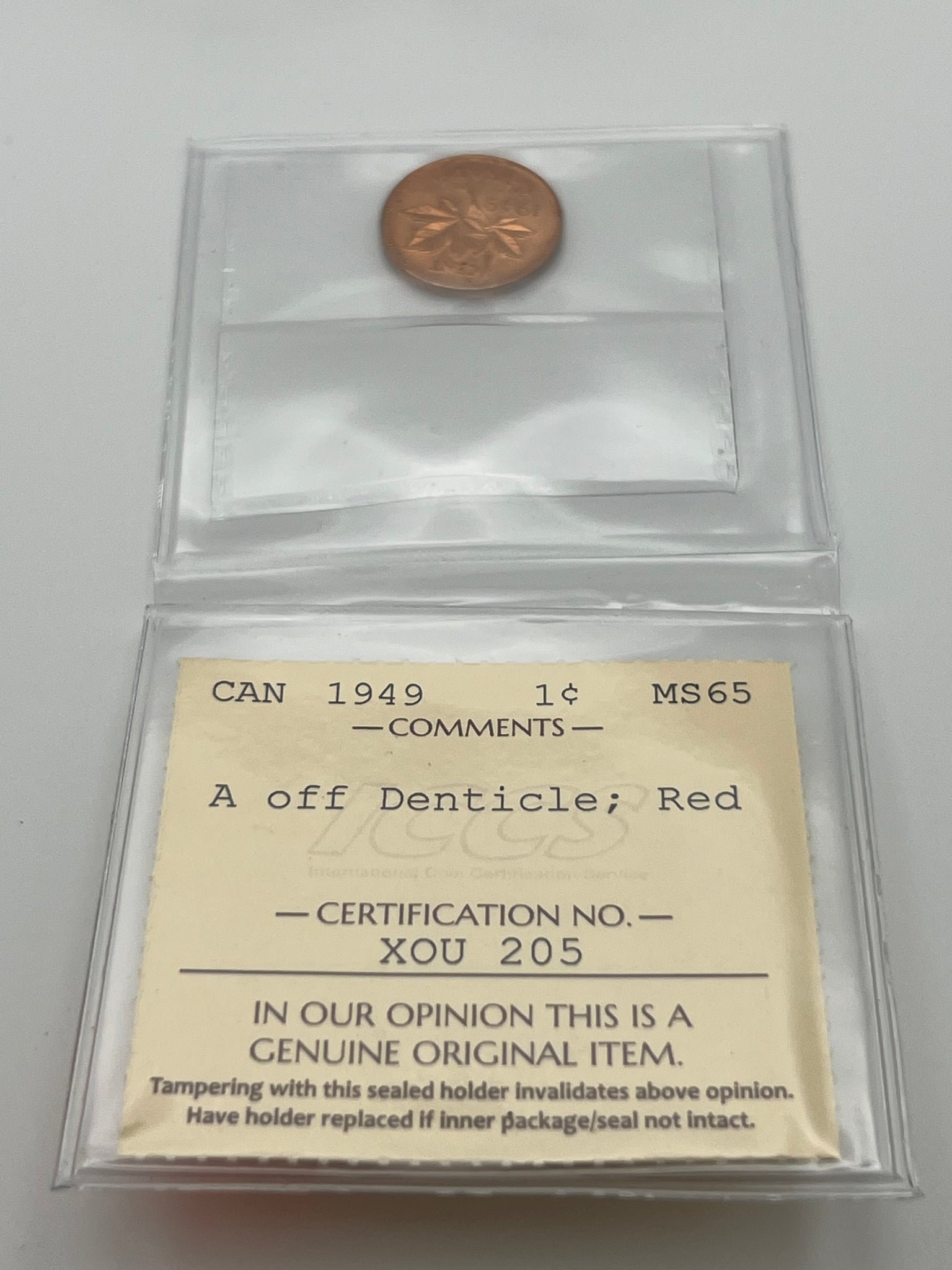 Canada One Cent 1949 A off Denticle MS-65 ICCS
