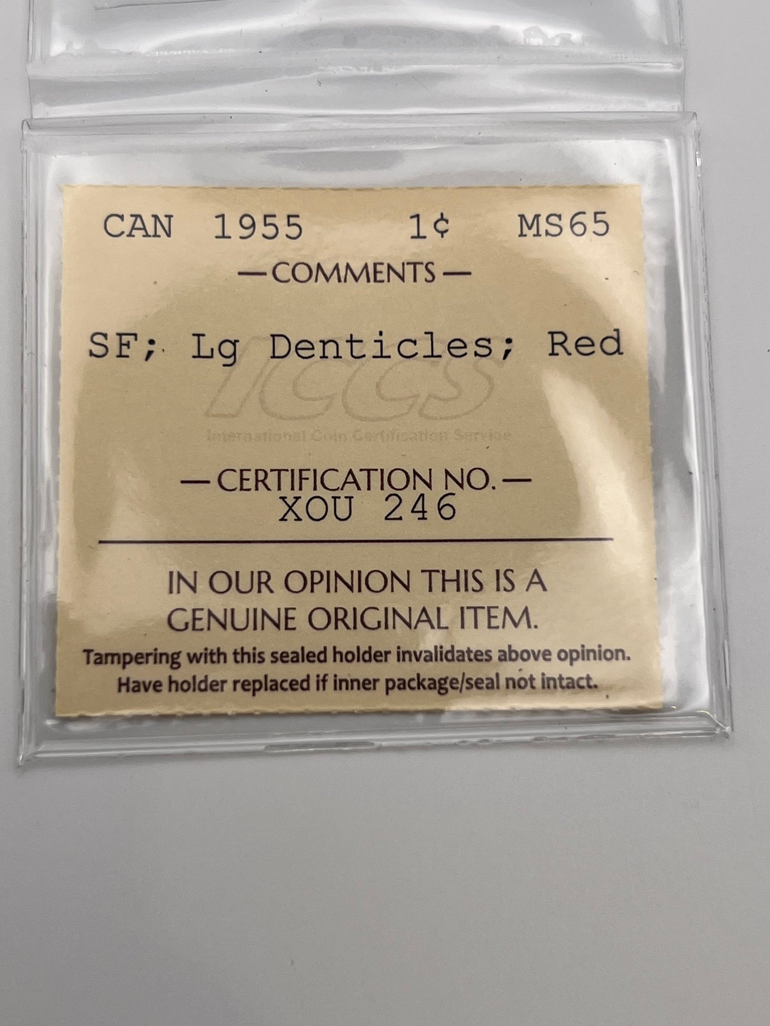Canada One Cent 1955 MS-65 ICCS-SF-LG-Denticles
