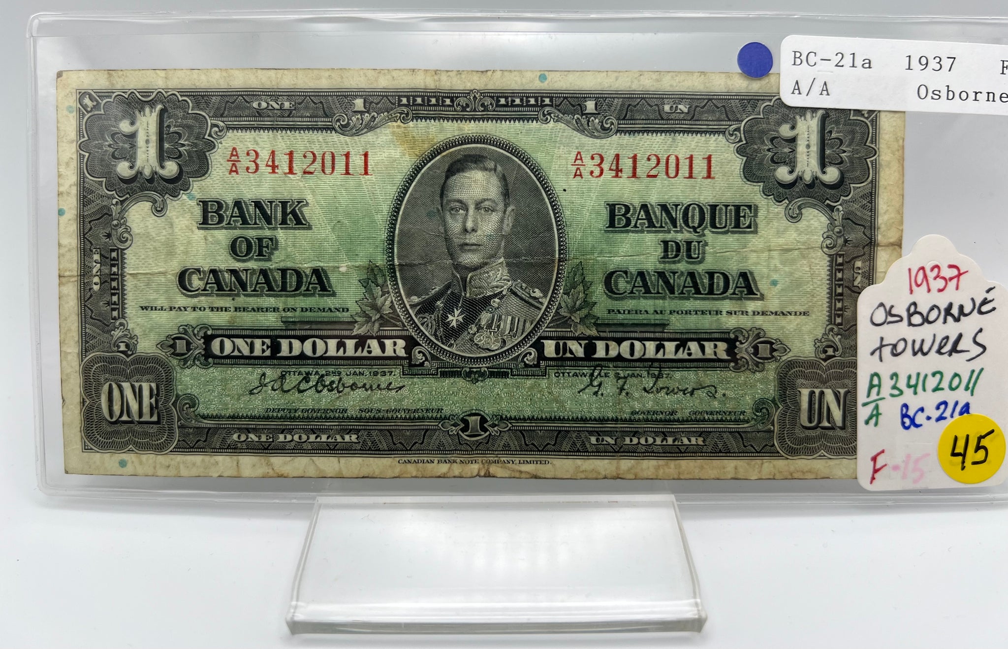 1937 Bank of canada BC-21a One Dollars F-12 Osborne Towers, Serial-AA 3412011