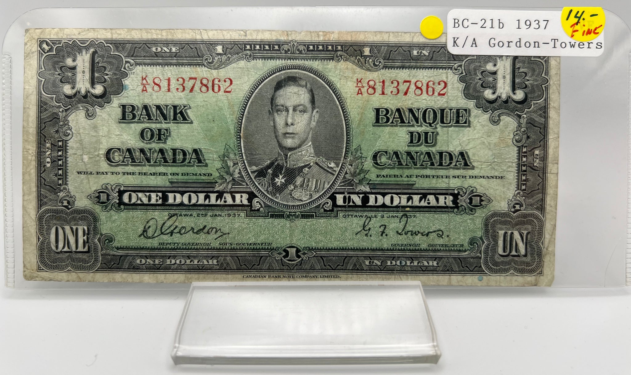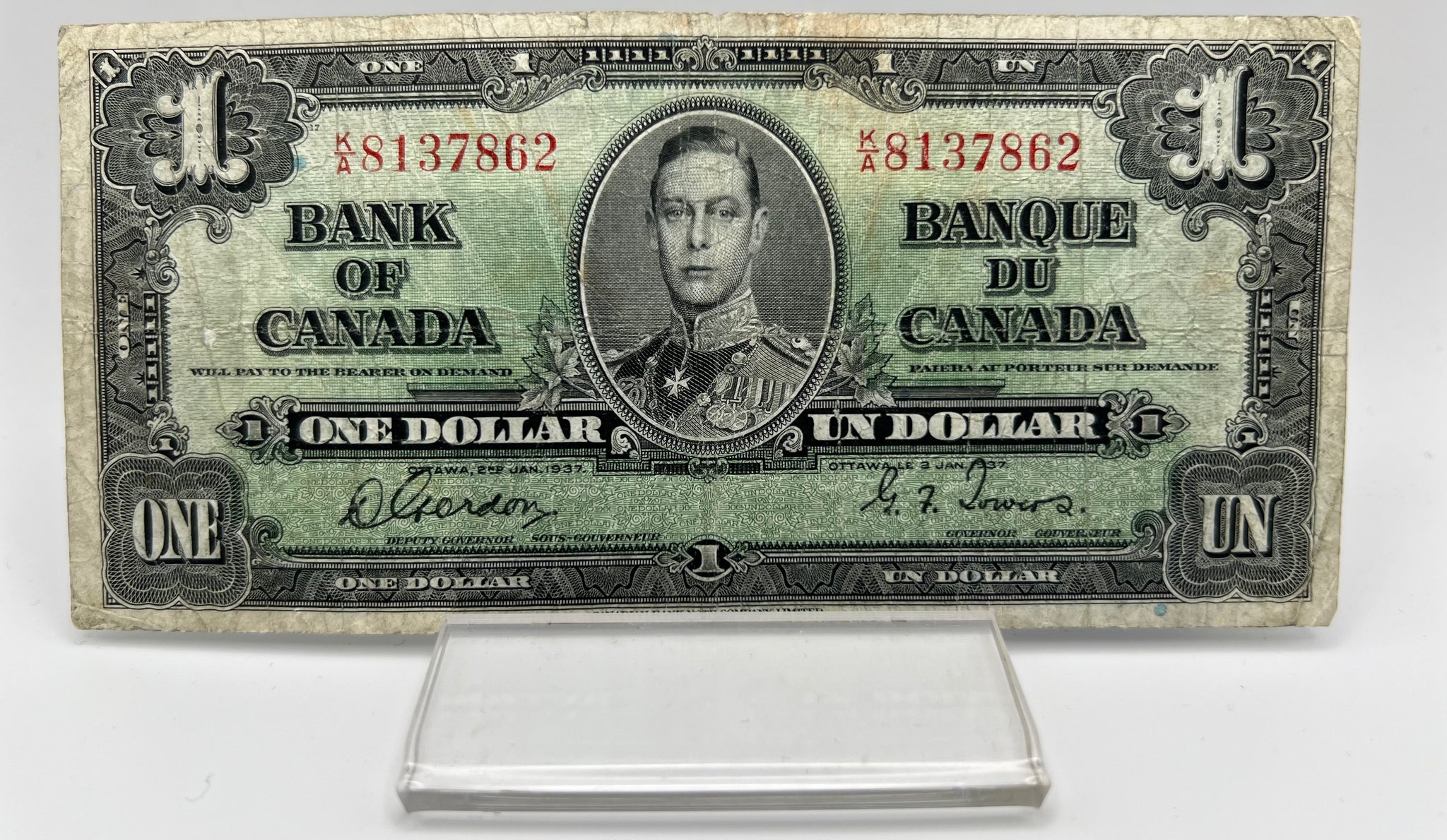 1937 Bank of canada BC-21b One Dollars f-12 Gordon Towers, Serial-KA 8137862
