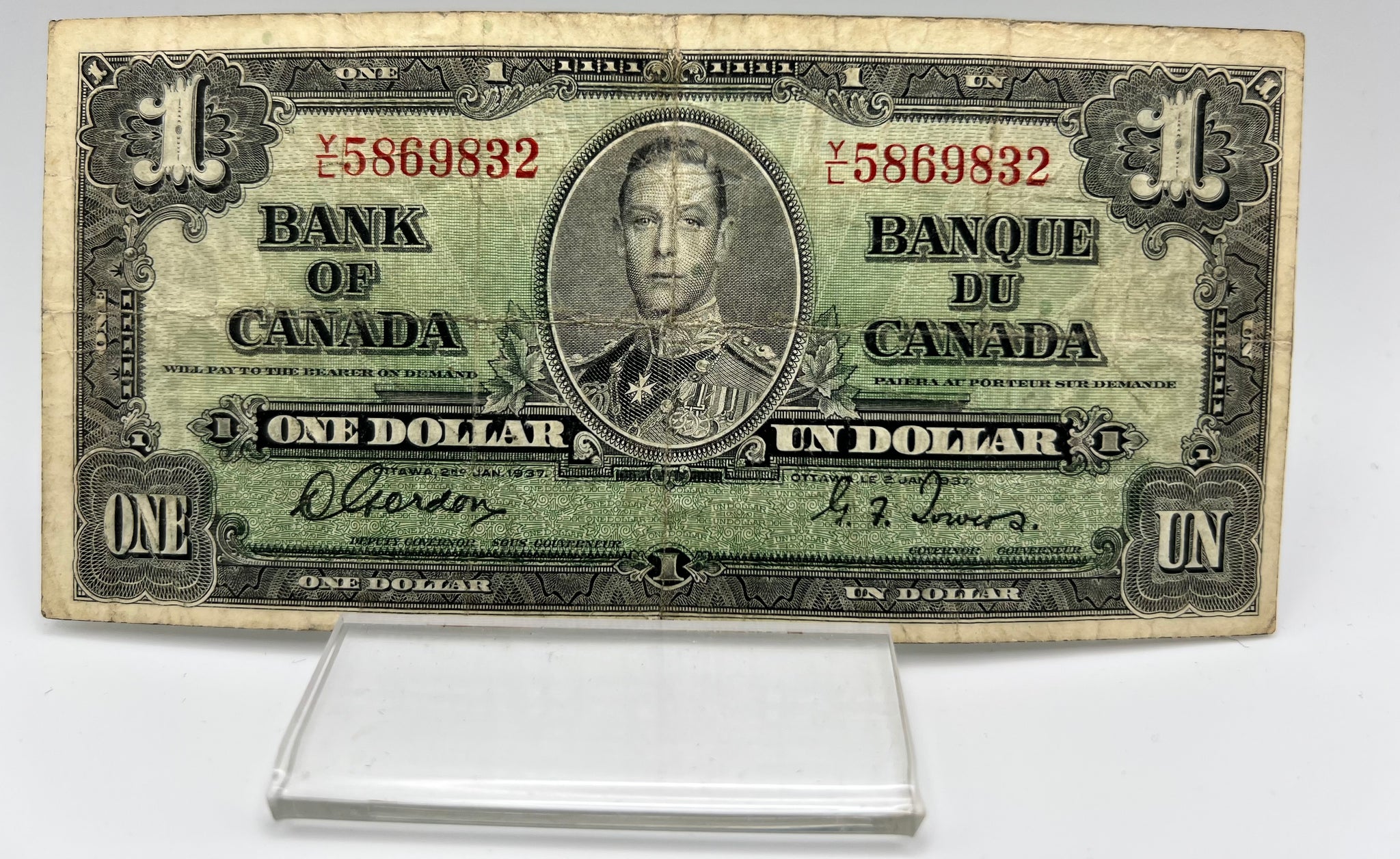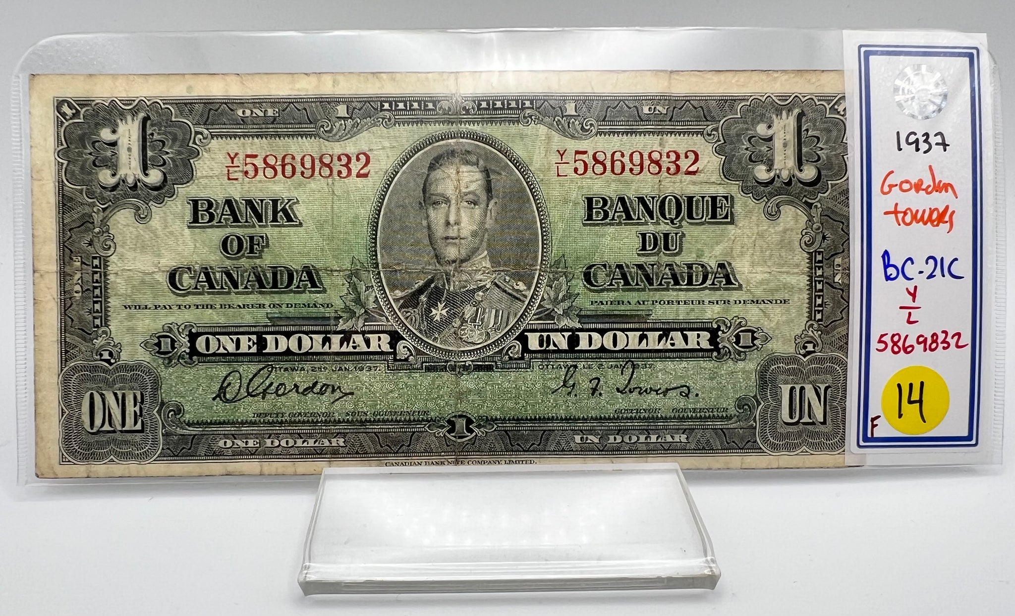 1937 Bank of canada BC-21c One Dollars f-12 Gordon Towers, Serial-YL 5869832