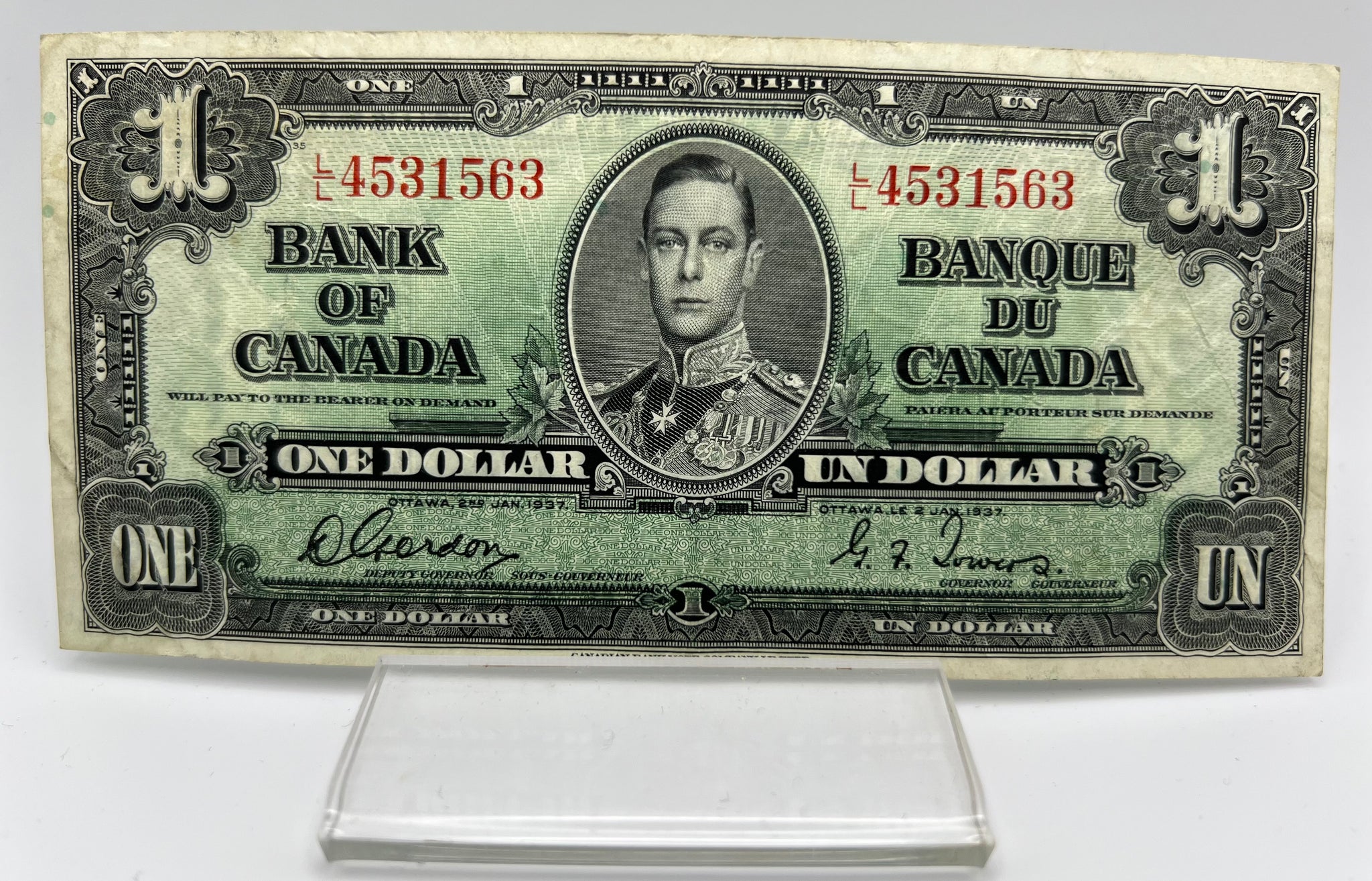 1937 Bank of Canada BC-21c One Dollar F-15  Gordon Towers, Serial-LL 4531563