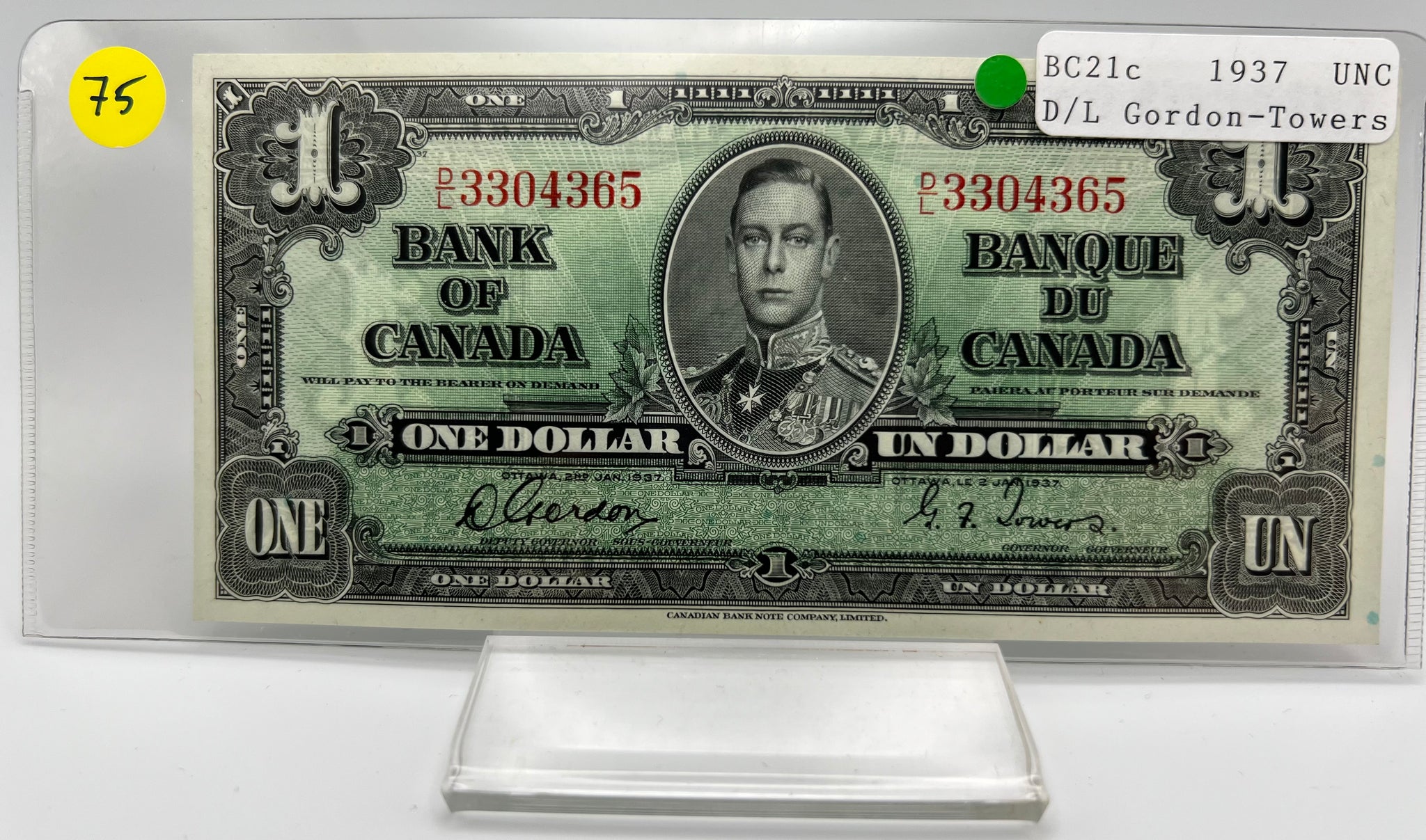 1937 Bank of Canada BC-21c One Dollar UNC Gordon Towers, Serial-DL 3304365
