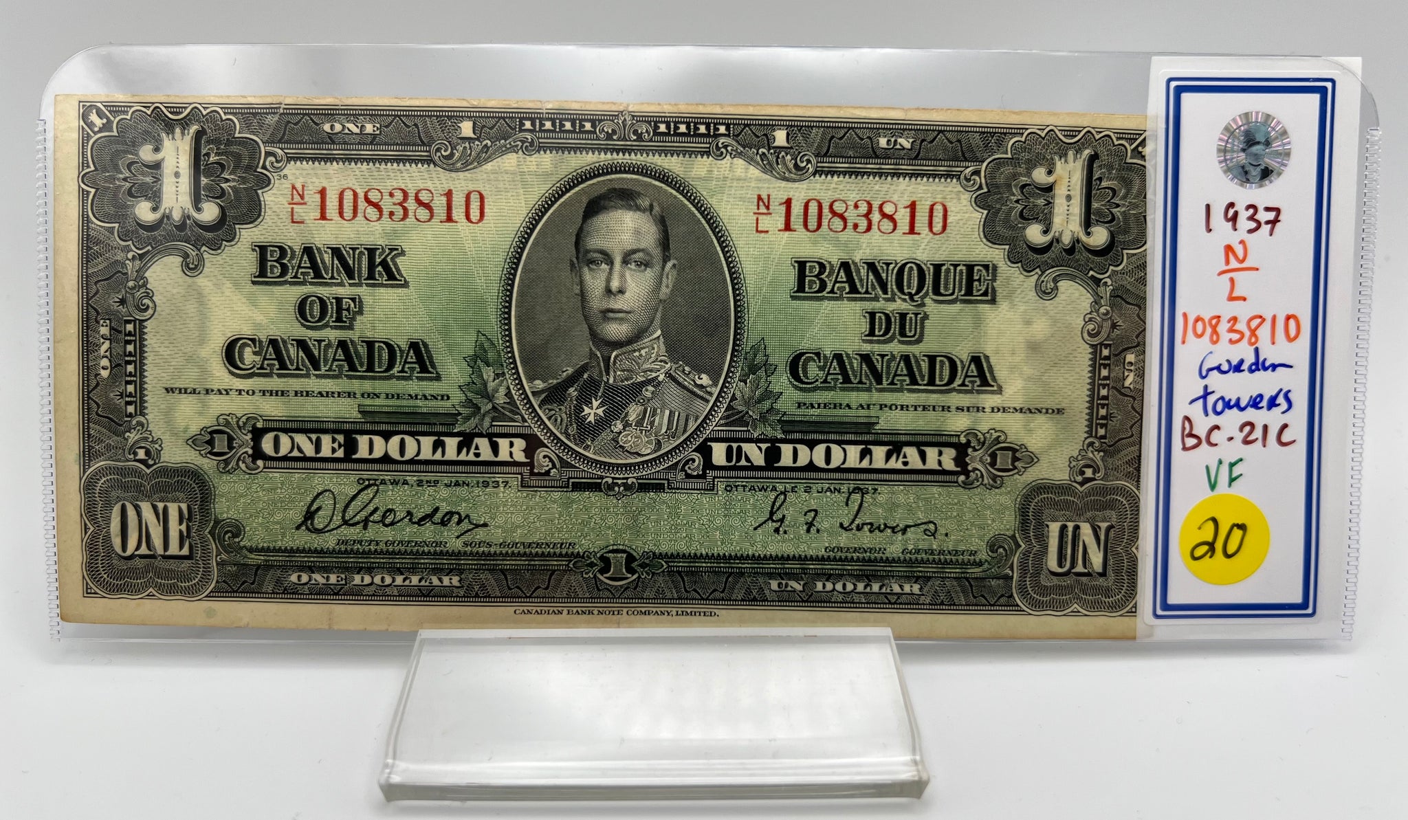1937 Bank of Canada BC-21c One Dollar VF-20  Gordon Towers, Serial-NL 1083810