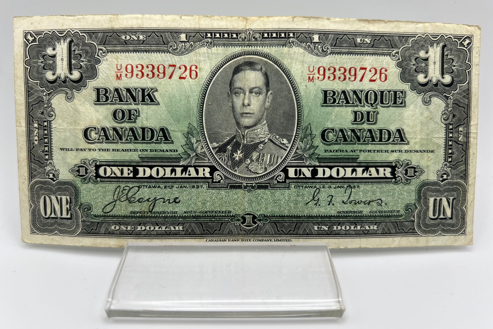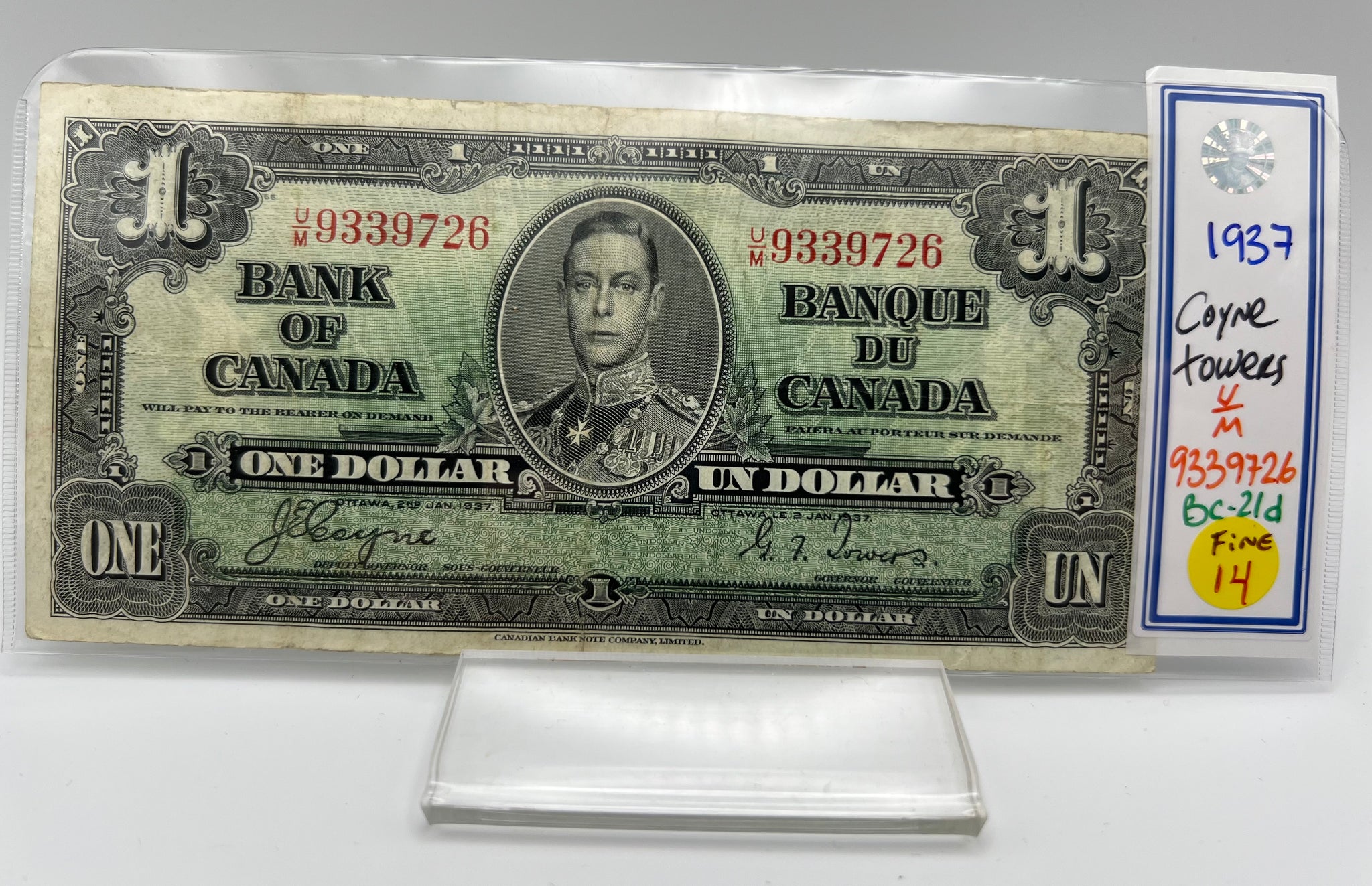 1937 Bank of canada BC-21d One Dollars f-12 Coyne Towers, Serial-UM 9339726