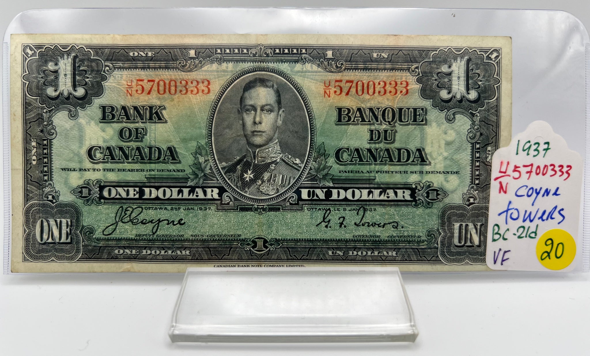 1937 Bank of canada BC-21d One Dollars VF-20 Coyne Towers, Serial-UN 5700333