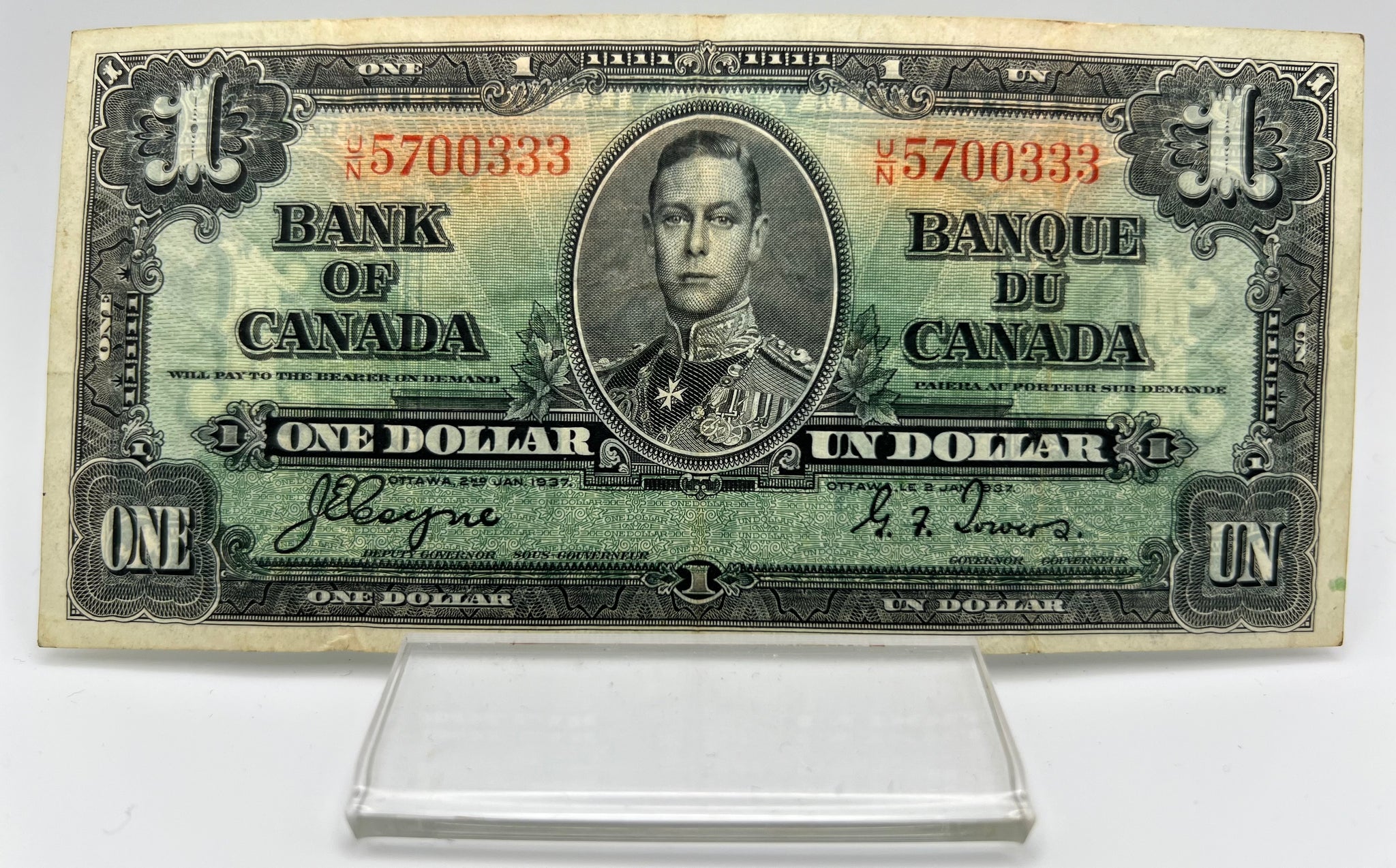 1937 Bank of Canada BC-21d One Dollar VF-20  Coyne Towers, Serial-UN 5700333
