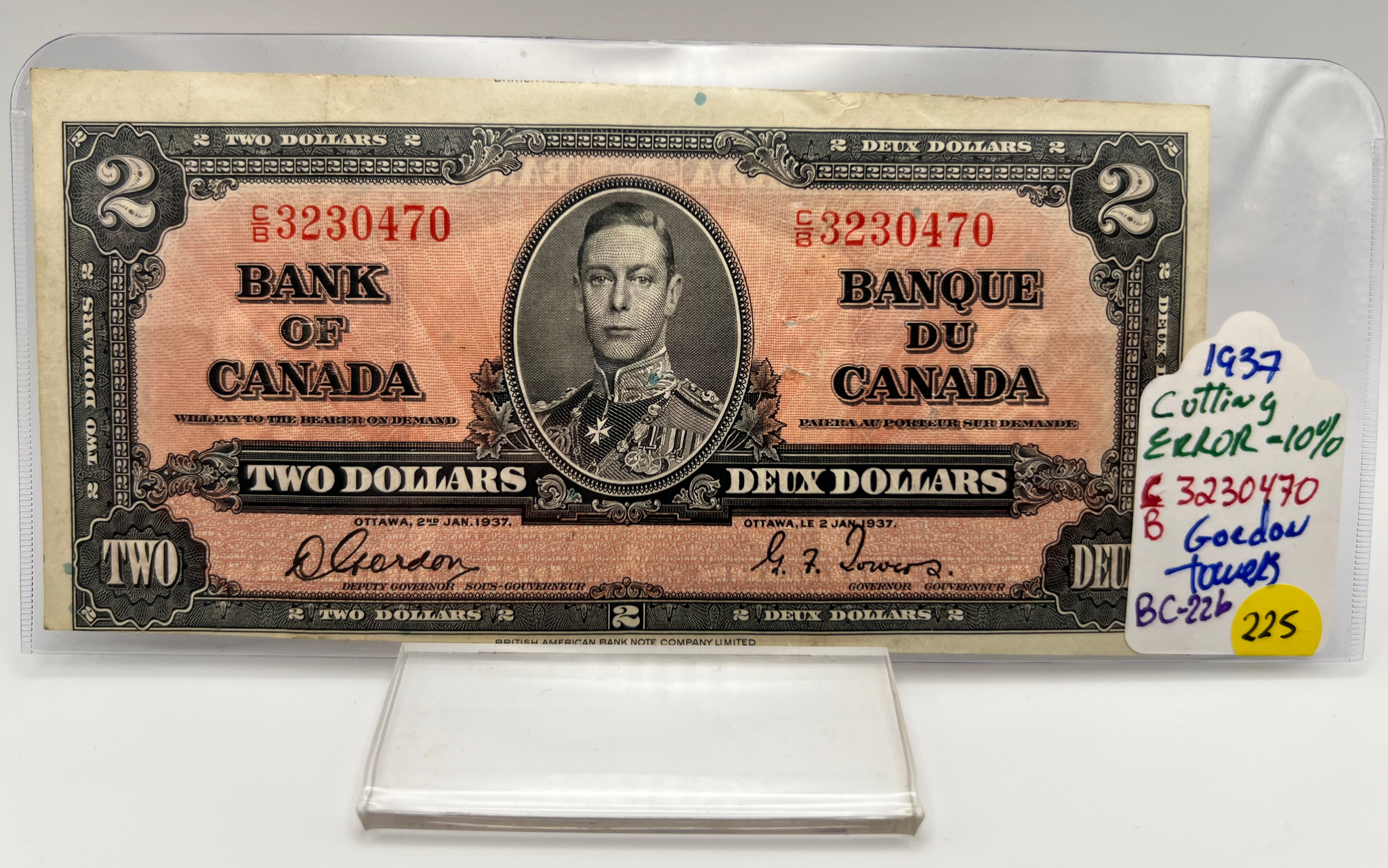 1937 Bank of Canada Two Dollars F-12 Cutting Error Serial-CB 3230470