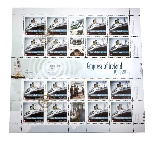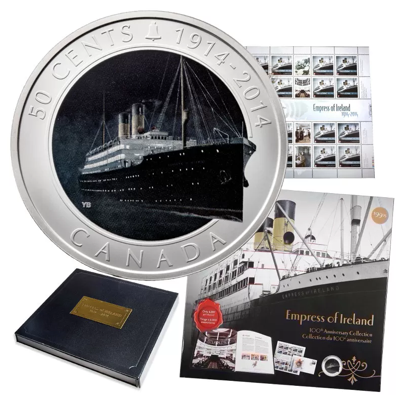 2014 (1914-) Canadian 50-Cent Empress of Ireland 100th Anniversary Collection Coin & Stamp Set comes presented in commemorative holder with colour historical booklet, commemorative coin, stamps, postcards, and more.