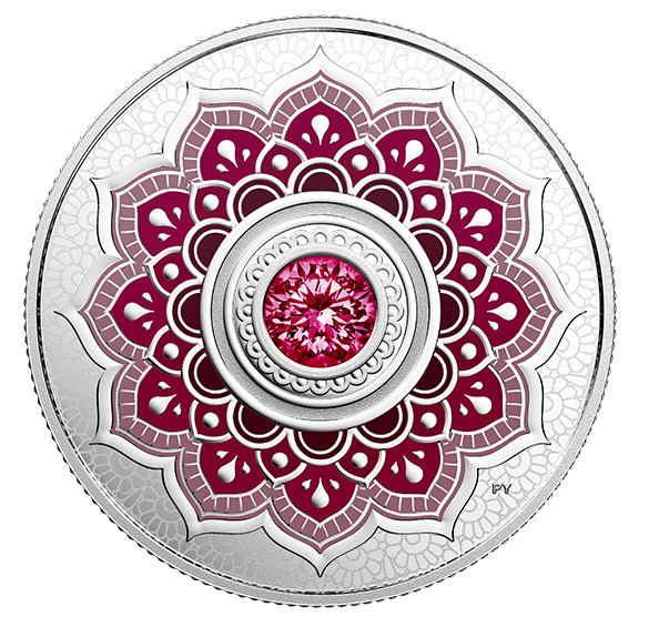 Designed by Pandora Young, your coin presents a cross-cultural celebration inspired by the ancient tradition of Indian mehndi. A symmetrical arrangement of highly ornate shapes and symbols form a 12-point radial pattern that reflects the calendar year. A prominent henna motif — the lotus — is among the finely detailed elements that emanate from the centre, where a colourful Swarovski®crystal represents the January birthstone, garnet. A selective application of colour complements the stone, while the playful contrast between soft and vivid tones highlights the layered complexity of the engraved artistry. The obverse features the effigy of Her Majesty Queen Elizabeth II by Susanna Blunt.