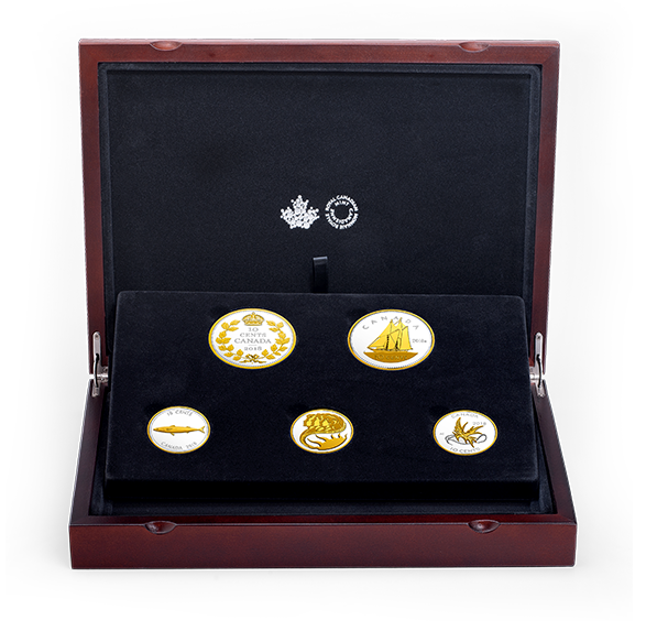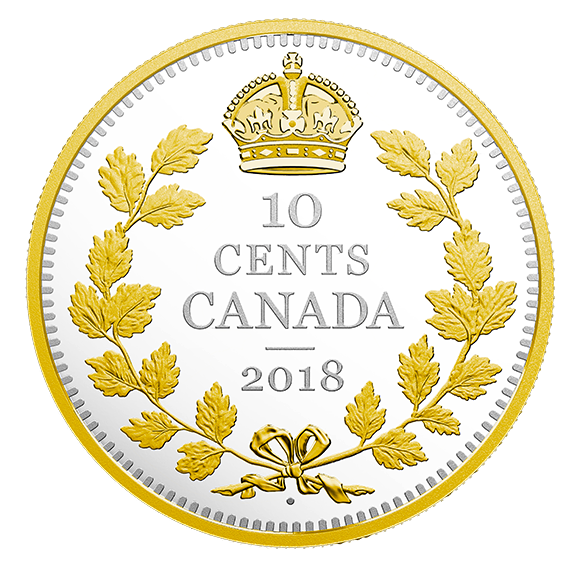 The five coins in your set are all crafted in 99.99% pure silver and feature Canada’s 10-cent circulation coin designs. The 1936 Dot and the 1947 Maple Leaf 10-Cent coins have a diameter of 54 millimetres and a weight of 62.67 grams; the 1967 Centennial, the 2001 Year of the Volunteer and the 2017 Wings of Peace 10-Cent coins have a diameter of 38 millimetres and a weight of 31.39 grams. Selective gold plating highlights the relief on the reverse and obverse, which features the effigy of King George V, King George VI or Her Majesty Queen Elizabeth II, as they appeared on the original coins.