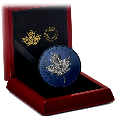 2022 50$ 5 oz. Pure Silver Coin – Blue Rhodium Plating-Maple leaves in Motion