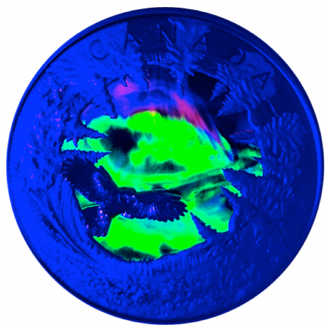 Thanks to a selective application of vibrant colour, the famous green, pink and purple hues of the aurora borealis fill the sky on your coin’s reverse, The colours are even brighter (and the night view, more realistic) when viewed directly under a blacklight (a blacklight flashlight is included with your coin).