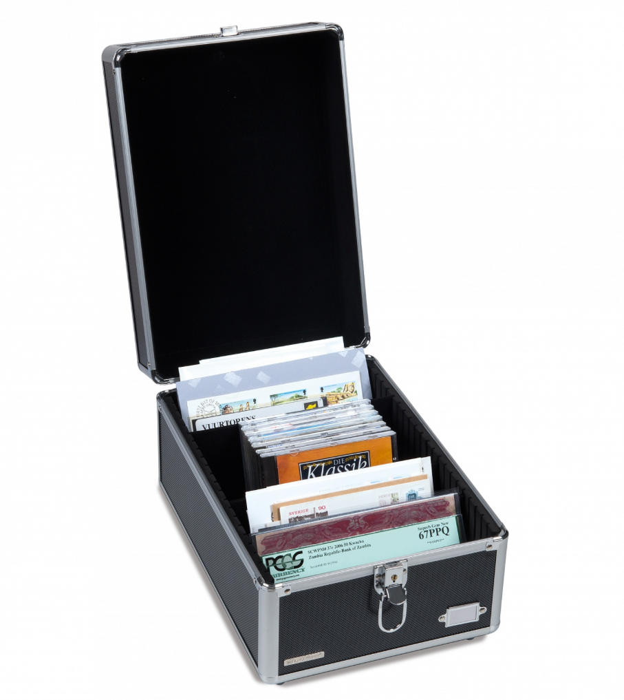 A collectors case for safe and convenient storage of coin sets, CDs, approval cards, postcards, banknote cases etc. Flexible compact storage provides space for collectors’ items up to a height of 168 mm (6 5/8") and a width of 220 mm (7"). Lockable (2 keys), completely removable lid. Holds up to 900 postcards,