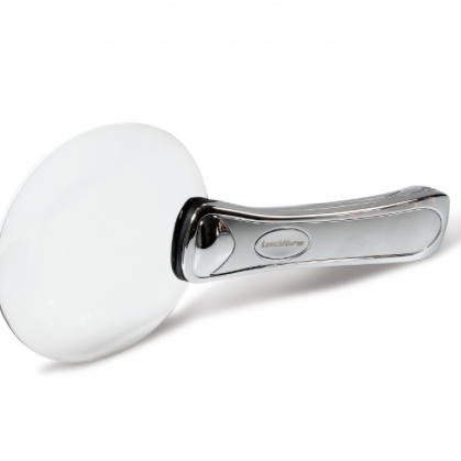 High-quality, frameless glass and ergonomically designed metal handle (chrome-plated) in a modern design. Excellent optical quality. Lens diameter: 3 1/2" (90 mm). 2.5X magnification. Battery operated, 3x button cell SR 54 to IEC standard (included), 2 very bright LEDs. Soft material cover to protect lens.