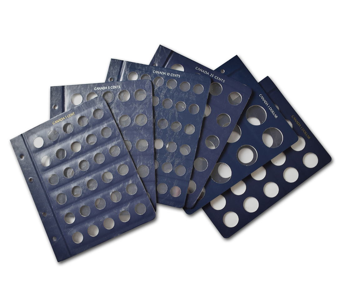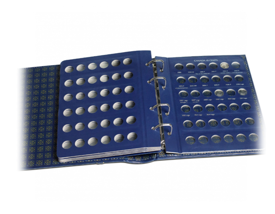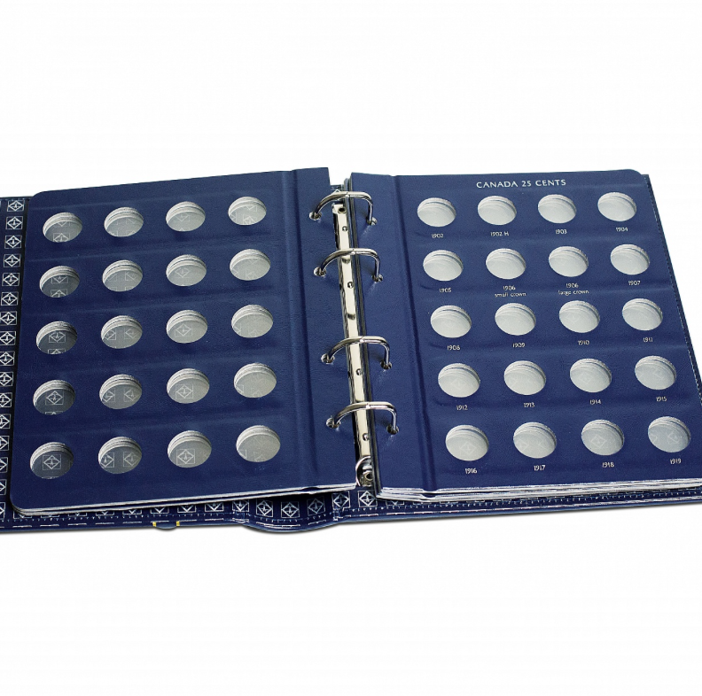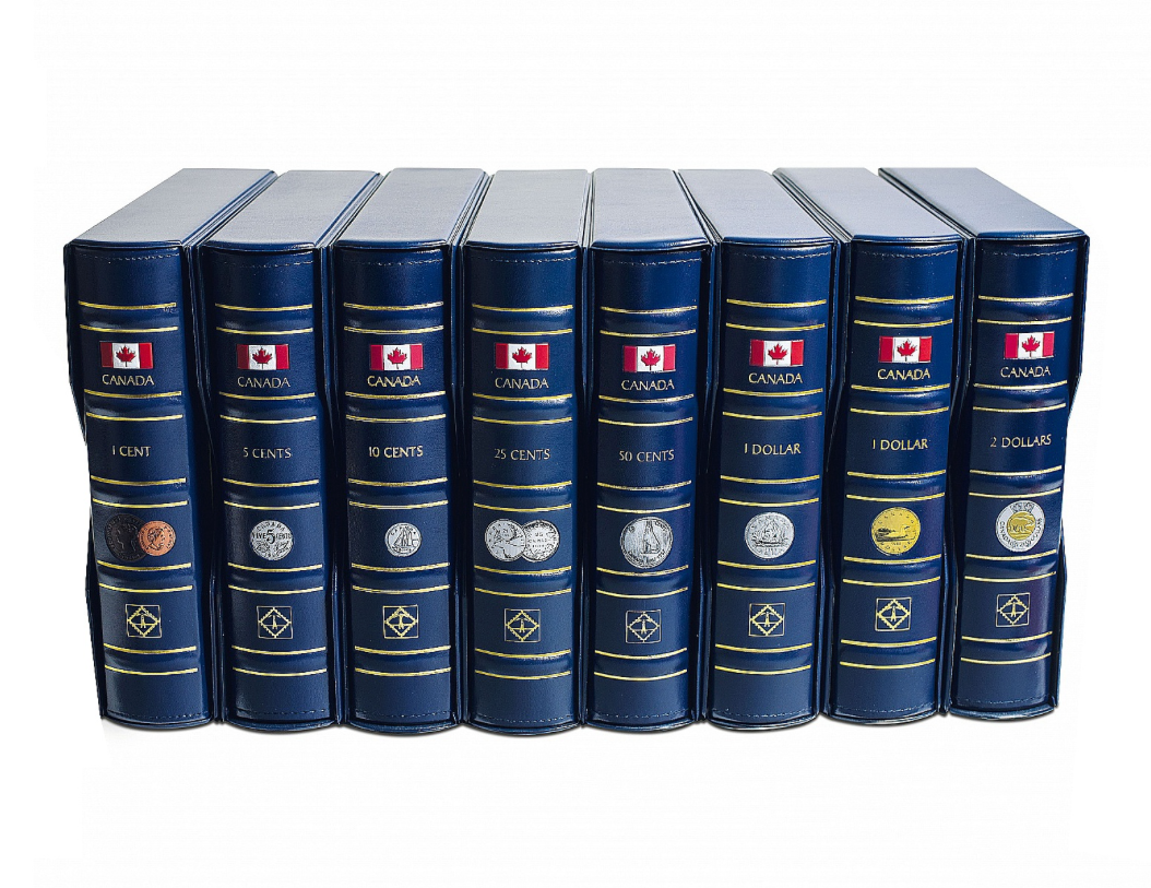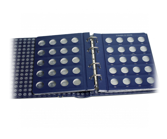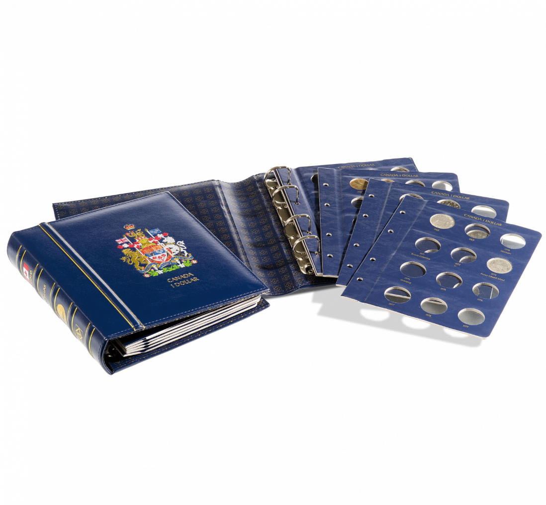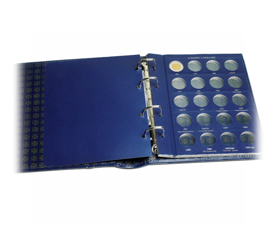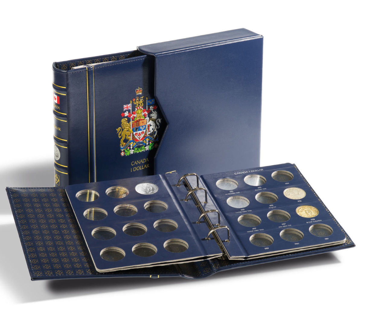 Build your own collection in these beautiful, handmade albums. The finely stitched seams, reinforced spine and elegant inner lining of these 4D-ring binders will be the perfect accommodation for your coins. Your coins are held in place by clear sliding inserts (free of acid and chemical softeners). For added protection we have included a matching slipcase.